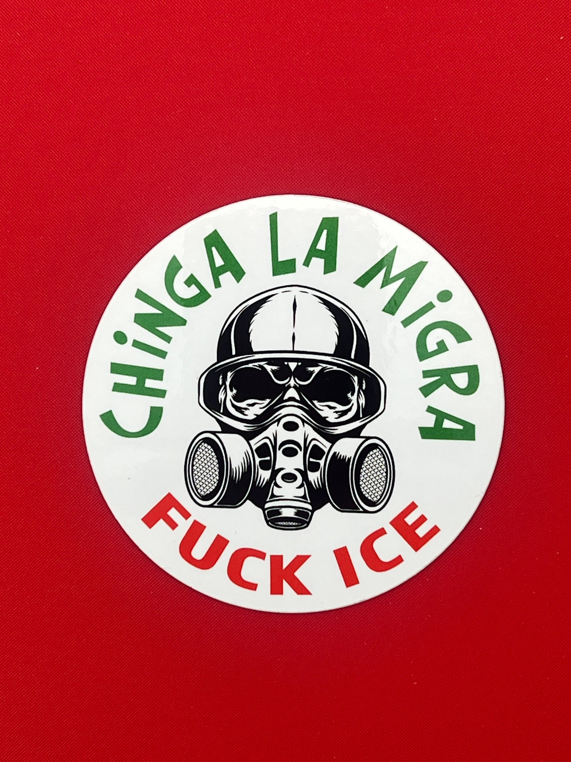 Large 3 inch water resistant sticker, ideal for water bottles, laptops, or even car bumpers. The design is inspired by the popular Mexican expression, Chinga La Migra. This sticker is a call to action for the protection of all immigrants, a demand from the government to the civil rights and civil liberties of all peoples. It is made of water resistant vinyl and comes with a crack-and-peel backing.